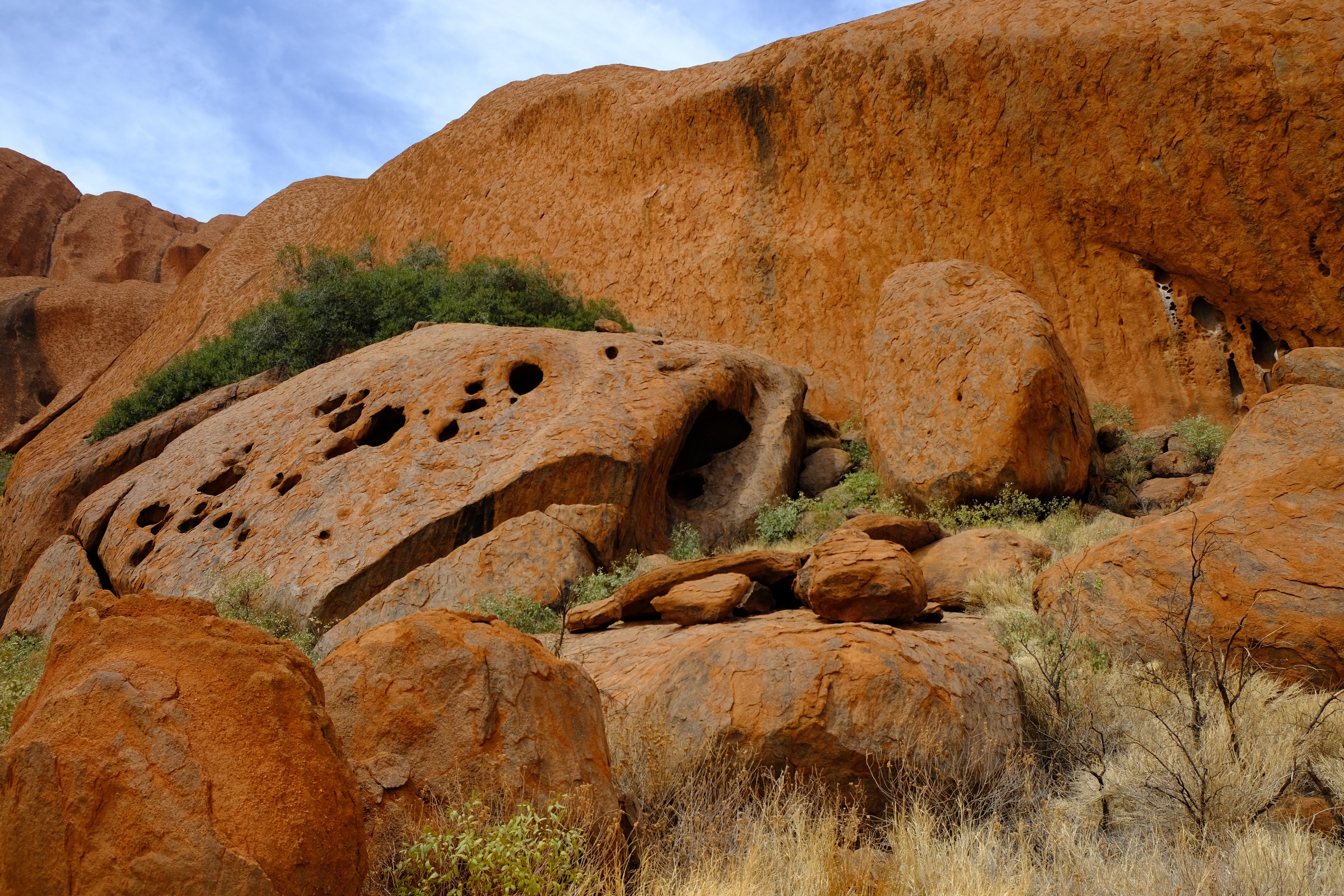 A Kata Tjuta un possibile percorso è quello attraverso la cosiddetta Valle ventosa che si addentra tra due delle Olgas sino alla cavità di un lago. Sospinti dal vento si può osservare che pur avendo lo stesso colore di Uluru, Kata Tjuta ha una roccia differente, più ghiaiosa, una sorta di conglomerato. In effetti hanno avuto un'orogenesi diversa e in periodi storici differenti.